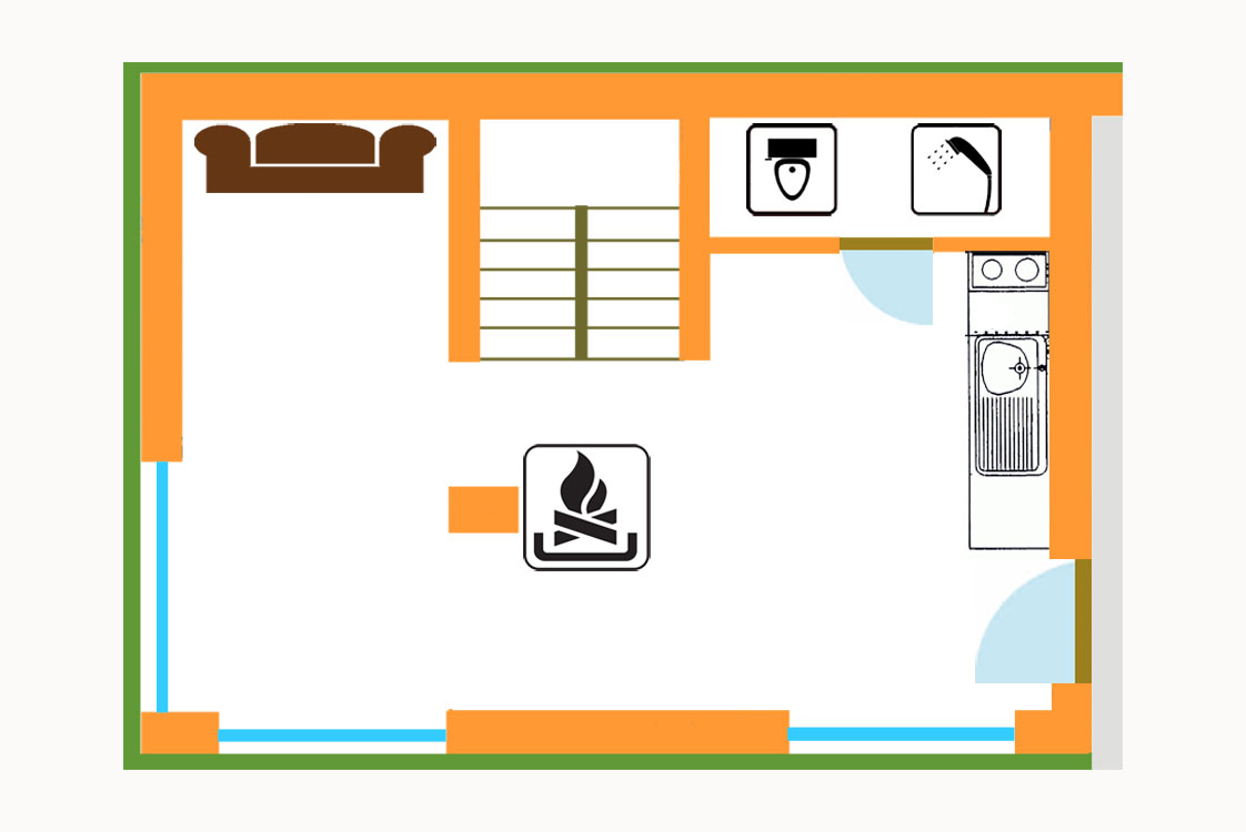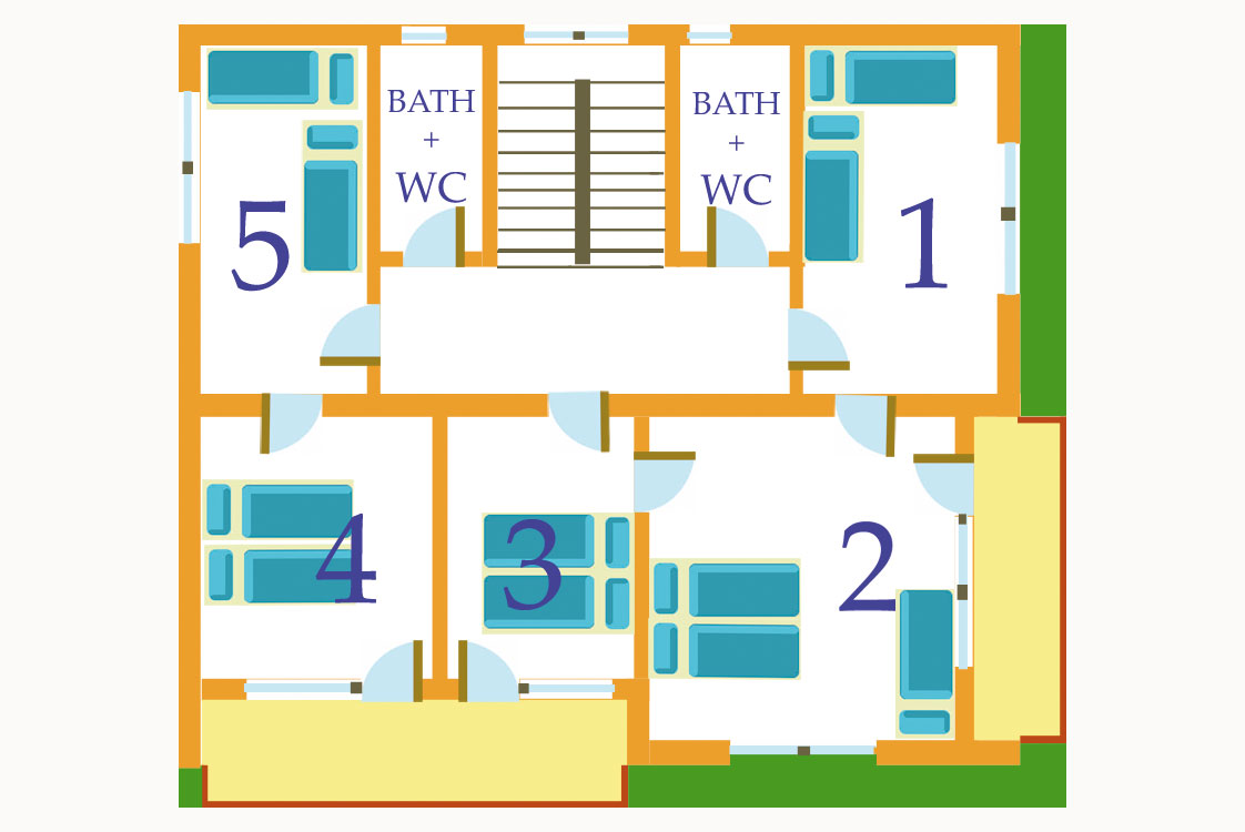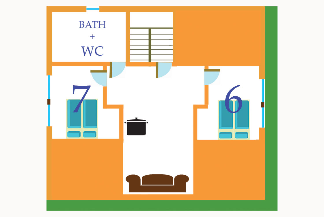 For family rooms 2 + 2 with extra beds and balconies and a double room on the ground floor there is a large fully equipped kitchen with two refrigerators, jerseys, stoves and dishes, a hall with a fireplace, TV / SAT, a small library and toys for children. You can see the layout of the rooms below in the drawing. When occupying family rooms, there is a bathroom for a double room on the ground floor.