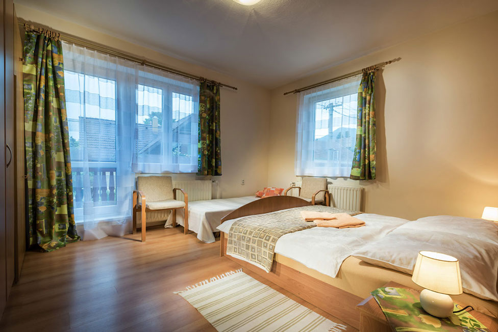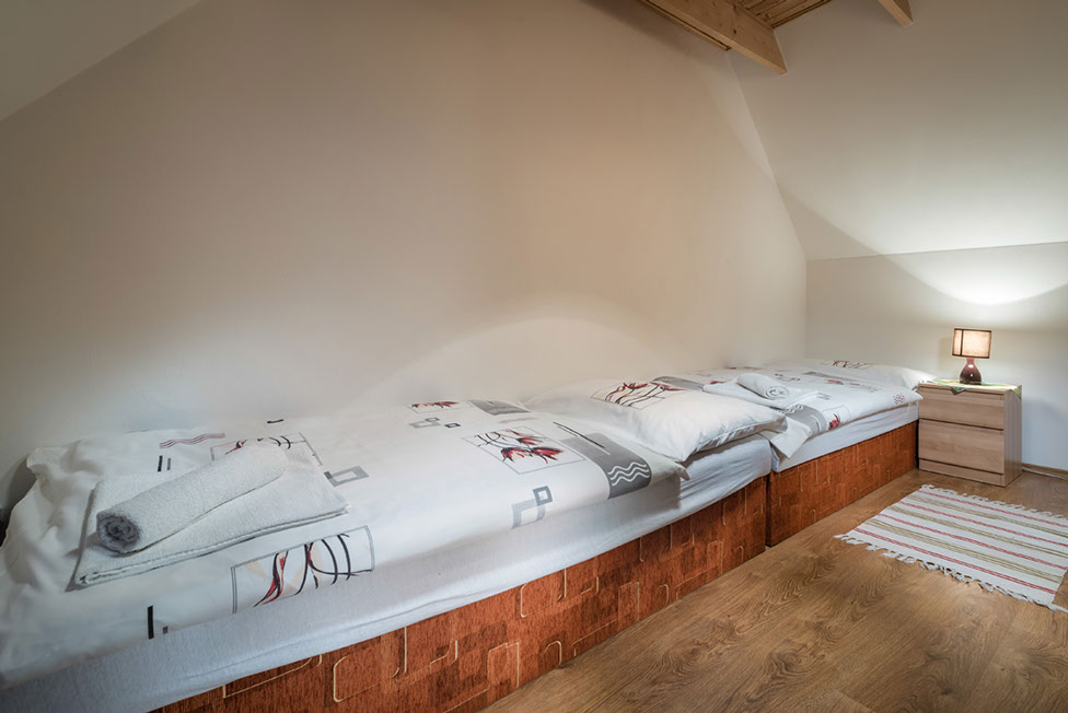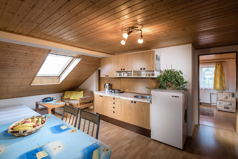 The attic apartment is located on the second floor of a large house. There are two double rooms, kitchen and bathroom with toilet. The kitchen is fully equipped with dishes, refrigerator, kettle and double hob. It is possible to use (add) extra beds in the rooms and in the kitchen. The entrance to the apartment is via the main staircase.